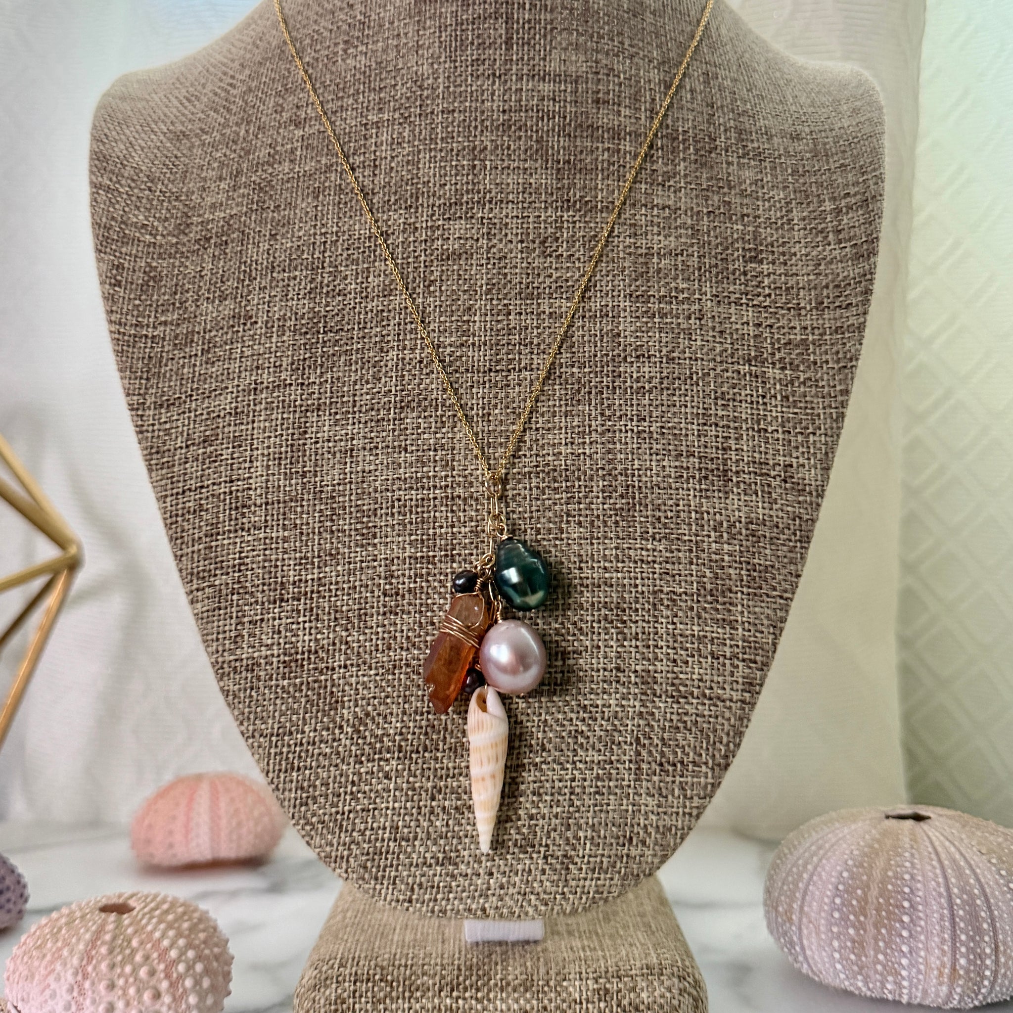 CLUSTER PENDANT INCLUDES: BLUE HUE CERCLE 10.6MM X 14.7MM TAHITIAN PEARL, LARGE 12.5MM X 13.5MM EDISON PEARL, SPIRAL CONE SHELL, 2X FW KESHI PEARLS, & QUARTZ CRYSTAL.